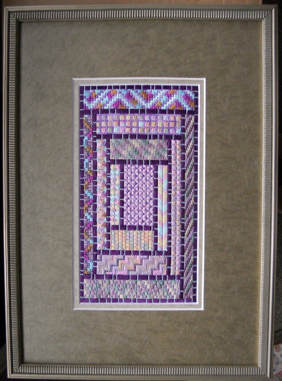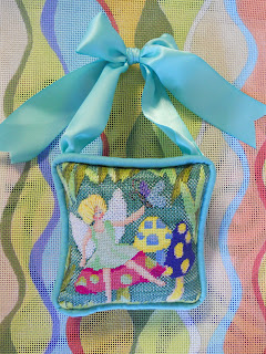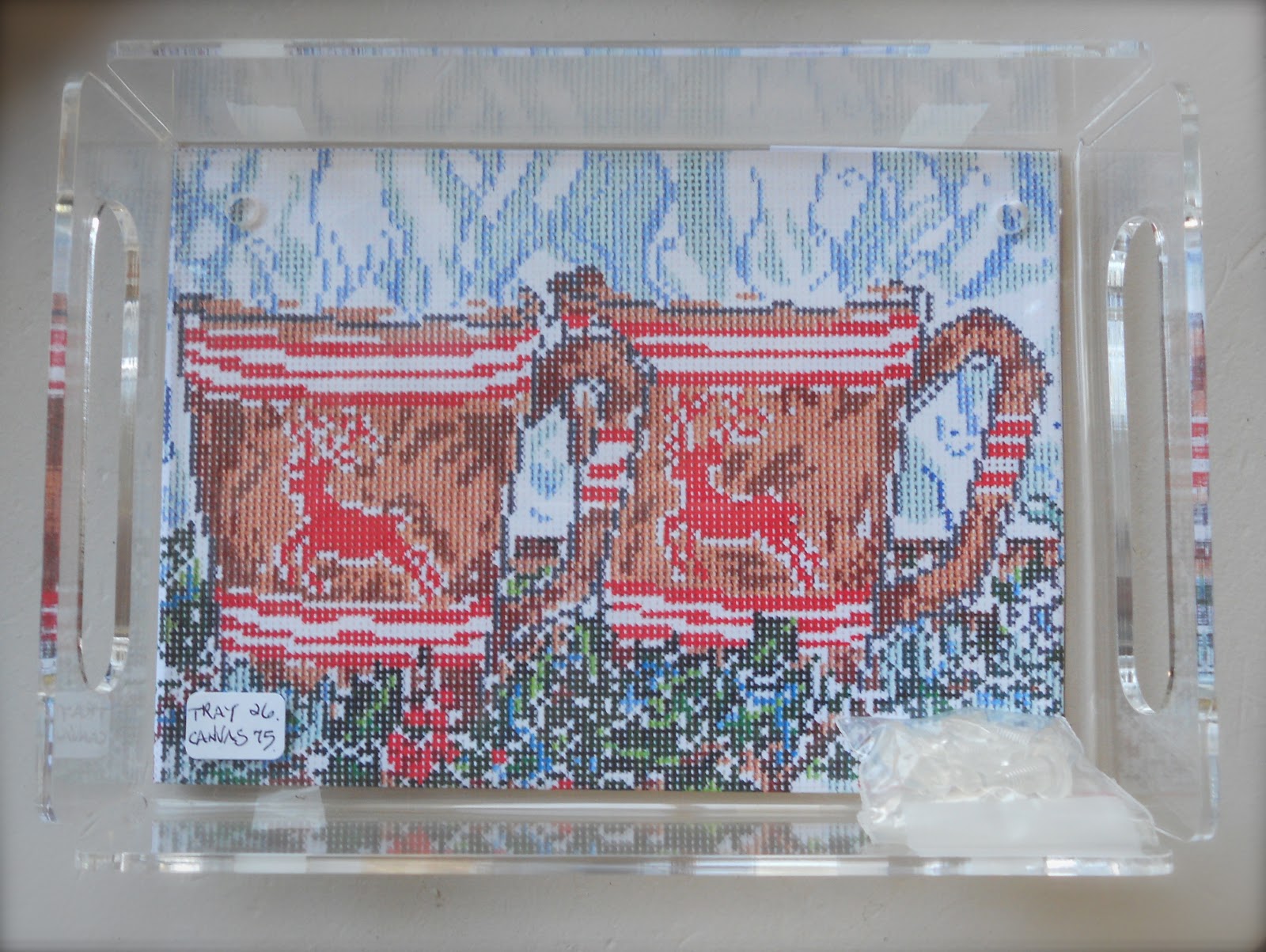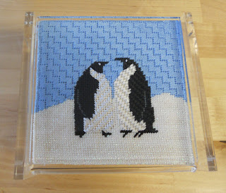 I was so pleased when my finisher returned the tooth fairy pillow below with a lovely heavy weight turquoise satin ribbon; the back has a full width pocket and custom embroidery from Grandmom above. I took the picture on top a Sally Corey canvas, the colors all looked so nice together but it appears to be competing here with the pillow! The penguin box, interesting fact both bellies were stitched with the same neon ray in opposite directions and what a difference they are from one another. Below is Lavender Fields, a class to be offered this fall. Odd colors (as per the guide) but is still very attractive and reads well from a distance which is always a plus in my mind. Below is Orna’s Hamsa (one of favorite designers for charted work). Lastly is a tray and canvas I just received. I thought it’s good to show here because the penguins are mounted within one of their acrylic boxes. The blurry thing in the lower right corner is a bag of small plastic screws required to attach the the bottom layer of the tray. The tray is complete, then you sandwich your canvas below the bottom with another piece of acrylic below. Pillow and Lavender Fields stitched by Carole, Penguins by Ruth, Hamsa by myself. I do offer framing services too.
