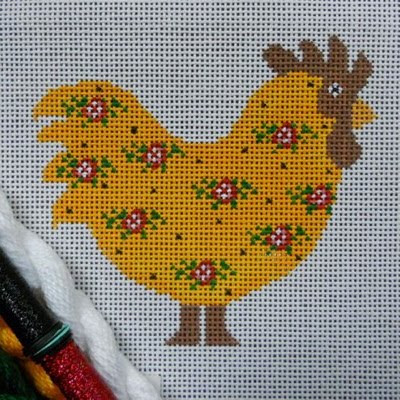 Cooper Oaks offers this handsome rooster with a floral pattern on his flanks. Too bad real roosters don’t come this way, don’t you think? A thread kit for Mr. Rooster, and a very suitable wood tray from Sudberry are posted to our web store along with the canvas.