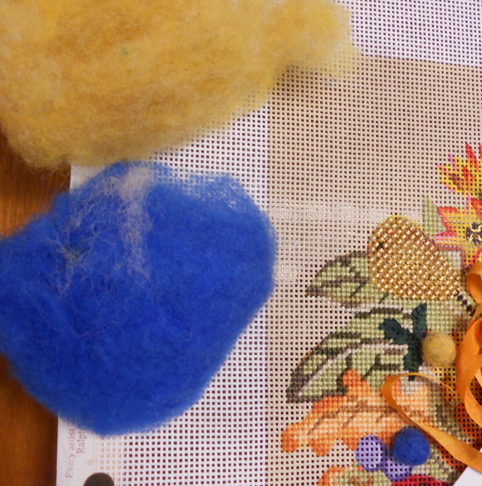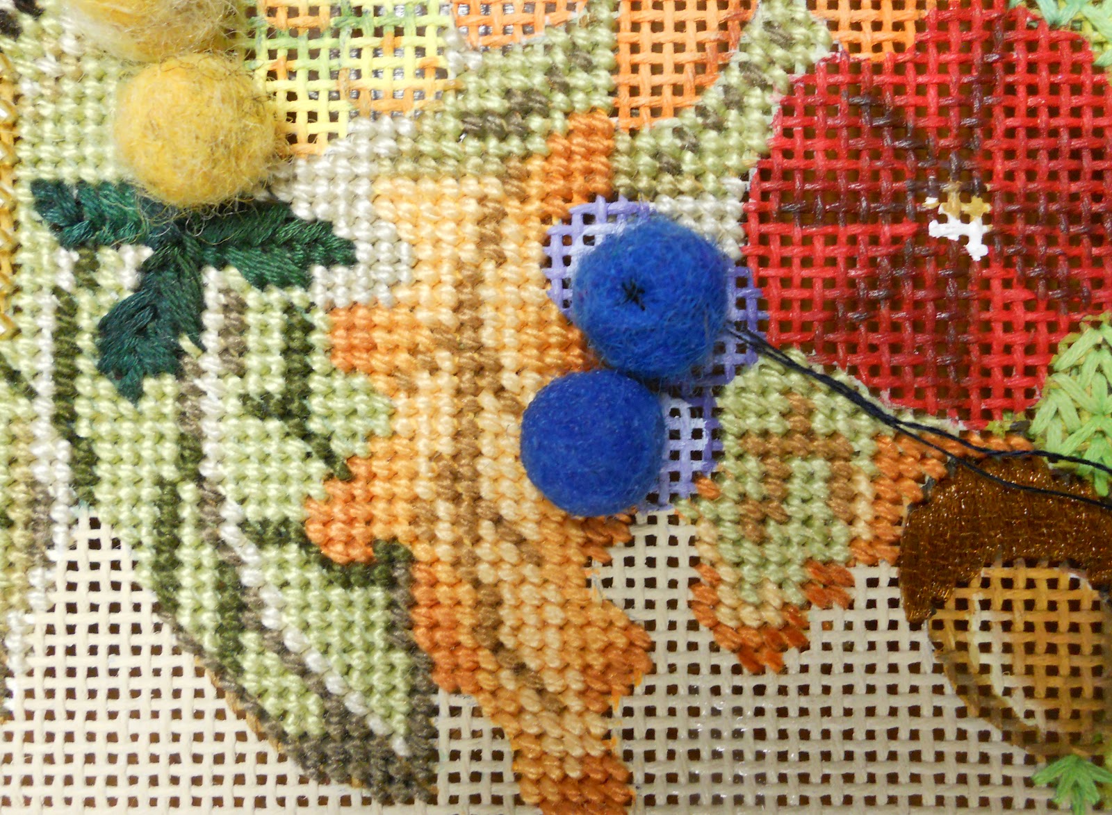 Miriam walks in today to show me her progress on Autumn Bouquet and mentions she doesn’t know where she’s going to find blue and yellow felted balls for the berries suggested in the stitch guide . So I said hey lets just make them! With just wee tuft of fluffy roving, lots of soap, a little water and some muscle anyone can make felted balls. (Not knowing how I could ever use them I’ve made lots of felted balls after brushing my long hair cats. Who knew it was the technique that would come in handy!) So once we rinse and squeezed dried the berries I stitched on the top a tiny cross stitch with a single strand of splendor; leaving two tails of thread on the bottom of the berry. With a needle I sank the threads to the back and tied on the berry- ball. Some we took sharp embroidery scissors and snipped a flat spot on the bottom to help the berry sit in place. On a few when I couldn’t get a snug tie off with the splendor (it would break) I took a needle and beading thread; came up to the front from the back, caught a bit of the berry and then went back through to the back. By really pulling on the thread I was able to tie it quite tight to the canvas.