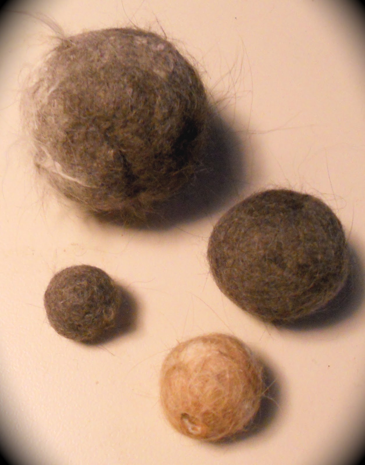 Hi Sandy, I can see where my post above could be mis-leading. Aside from making balls or shapes from roving and applying to a canvas what I think you may be trying to figure out is how to dry needle felt onto canvas, similar to the squirrels in Autumn bouquet above. For this you would place the foam behind the canvas so the canvas is lying flat against it, hopefully you can keep it on the stretcher bars. You then want to pull tiny amounts of the roving, like eating cotton candy in Barbie doll portions. With just your dry fingers scrunch the tiny amount of roving and gently push the felting needle through the roving, through the canvas into the foam. Try pushing the needle straight up and down and keep your finger tips clear of the needle! I say take tiny amounts of the roving because I think it looks best to layer the roving like painting with watercolors. If you clump too much on at once I think the look is less natural looking. the more you push the needle up and down the more matted the roving will be against the canvas. Then you can more lightly felt on top of your “base”. If you look at the underside of your canvas you will barely see any of the roving coming through, it just kind of gets tangled into the canvas threads. And yes you can pull it up and off the canvas like picking up a piece of cake crumb. Is this addressing your questions at all? Once you felt on top of a section of the foam block in will start to get depressed, eventually you’ll want to move your canvas on top of a more firm part of the block.
