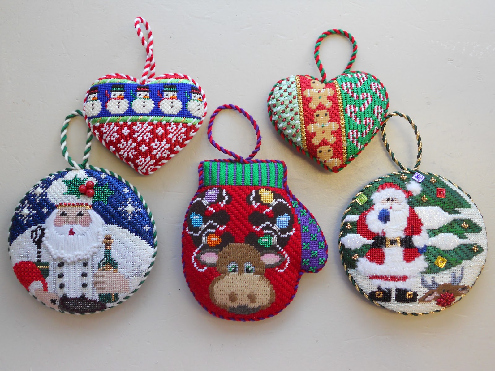 These just came back and for this customer this was the 12th pear in the series for her and she now has the Partridge to place at the top of her “pear” tree. Well done Nancy! The camel was such a pleasure to see come back from my stitching fairies, (one customers solution to buying more than she can stitch is to have someone else help her keep pace.) This is from Rebecca Wood stitched with the stitch guide by Diana Bosworth. Diana if your reading this it is lovely and it is so well balanced with your stitch selections simply enhancing the design. Since I didn’t have many of the threads called for most all the threads here are substitutions incase anyone wants to stitch this themselves. Next step is to have it finished as a stand up, for this Christmas. Lastly 5 ornaments for Kathy, as usual superbly stitched. Hearts are from Associated Talents, Santa’s both Rebecca Wood (I think) and the Reindeer mitten from Painted Pony. In terms of finishing here is an example of different levels of finishing though both very well executed. The pear at the top is done by a finisher who excels at quality and knows how to embellish beautifully. The 5 ornaments at the bottom were done by another finisher who is a fine basic finisher at an economical price. (Economical meaning half that of the pear finisher.) Its awkward at times as a shop owner to ask “how much are you willing to pay?” but it goes along way in terms of customer expectations and final costs.