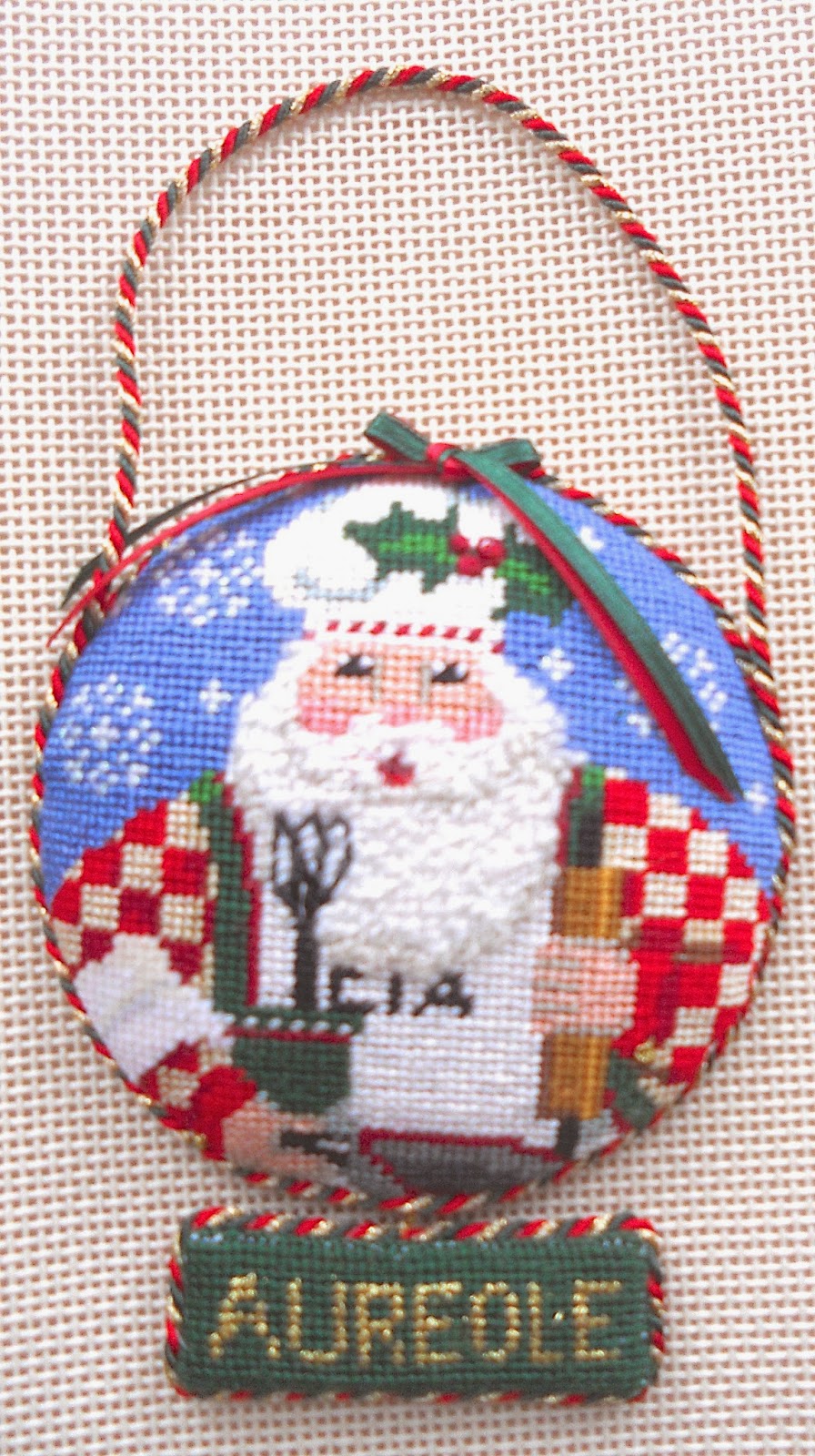 The ornament below, baking Santa, was stitched by Helene for her daughter who is a student at the Culinary Institute of America (CIA) and recently completed an internship at Aureole in NYC.