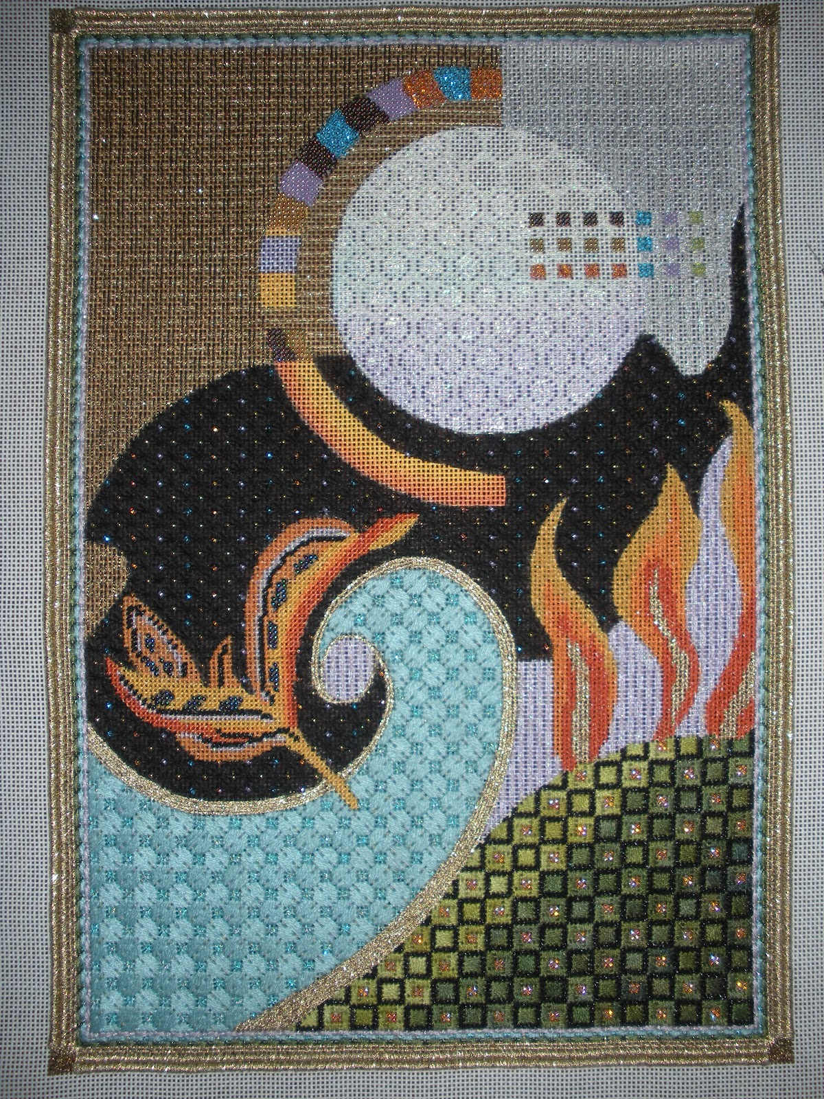 Wow, ask and you shall receive, thanks to all. We now have 8 for next Saturday what fun. Once Sharon and I pow wow I’ll have some dates for her next visit to the shop. If your interested let me know and I’ll put you on the “to call” list. May not be until fall with ANG Seminar happening and the Columbus trade show. We’ve talked about doing Graphic Wave as a project based class so this is a possibility as an alternative to canvas embellishment. Here’s some pictures from Miriam’s hand, never taken a class with Sharon so its a testament to just how good Sharon’s stitch guides are. Fish out of Water, Moonshine, and the now infamous Horses’ Asses. I think you can click on these to make them larger incase you suspect a resemblance to your ex in the last one. Miriam has stitched these all (and others too) in 2012,