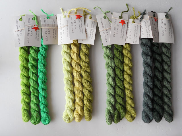 Silk ‘n Ivory has added four new greens to their line. They’re the ones with the red stars on the labels and I have photographed them in between existing greens to give you a context of color. Starting on the left is #229 Putting Green sitting between grasshopper and leprechaun. Next is #230 Toad sitting between apple martini and tumbleweed. Third to the right is #231 Relish between guacamole and tumbleweed (again) and lastly is #232 Chutney laying between spinach and pesto. I never realized we needed more silk n ivory greens but these are not near duplicates like others in their line. OK, now many don’t like silk ‘n ivory because of pilling. I won’t say it doesn’t pill but to minimize this you might need to beef up your needle size so the thread can’t rub against the canvas weave as much and more importantly use short strands. My regulars know if there’s one thing that gets going its seeing them hide (because they know better) the fact that they stitch with long strands. Whats long? anything more than 14″. I recently heard advice at the show that once you open up a skein of silk ‘n ivory DO NOT cut each end of the skein because by doing so each of your stands is now too long to stitch with to yield good smooth unfuzzy stitches. Cut the skein in thirds. Be nice to your threads and they will be nice back.