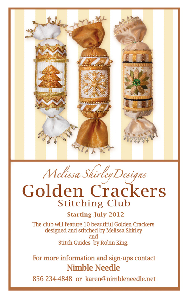 I’m pleased to be offering Melissa Shirley’s Golden Crackers as a ten month club. Shipping will begin first week in August and continue one per month through May 2013. Canvases and Guides are by Melissa Shirley and Robin King; need I say more? Canvas, guide and special embellishments $54.00 each with free shipping. Threads additional; as I understand there is a similar set of threads used for most with accent threads for special effects. We are offering a limited time special on this club: Pay for all 10 crackers upfront for the price of 9! This Special Offer may be purchased through our web store. Offer expires June 6th 2012.