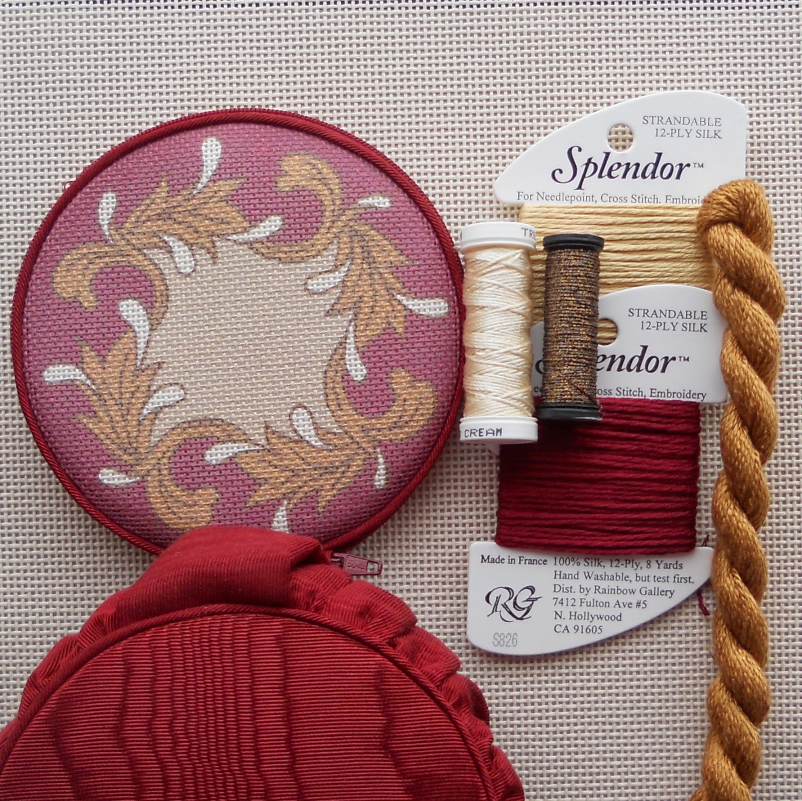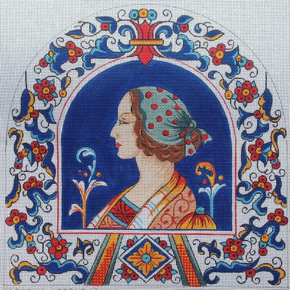 Its been too long since I last received new canvases by Creative Needle. Her designs are slightly different than average, some have more unusual color combinations such as the floral below. She also has fine quality pre-finished jewelry cases. 5″ in diameter makes them quite usable even for things other than jewelry.