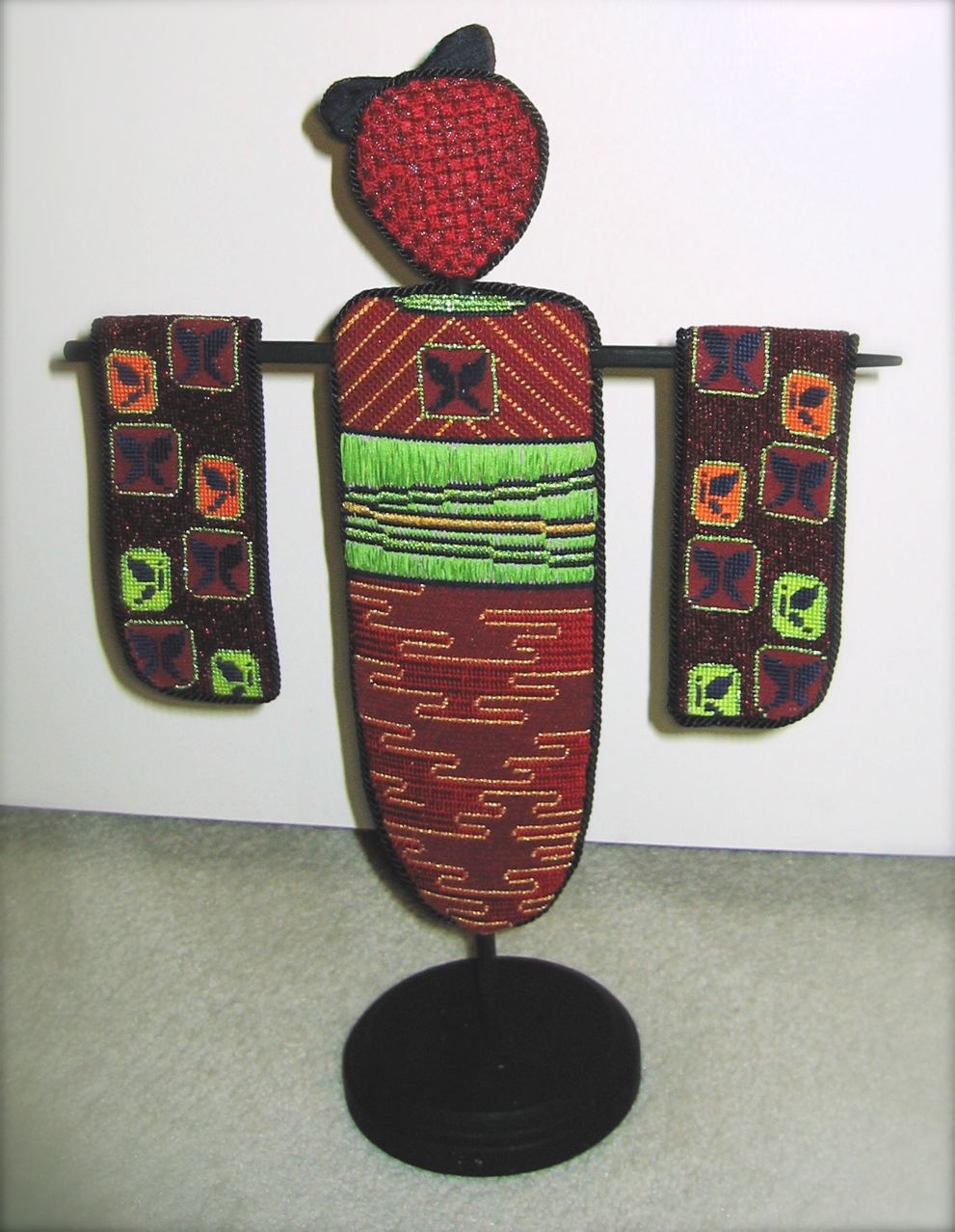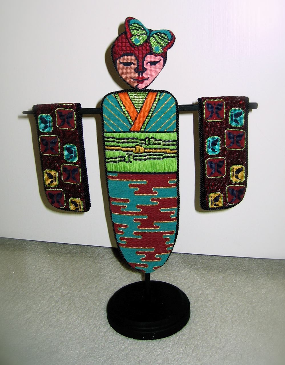 Mioshi Doll by Red Thread. 7″ x 12″ $98. Stich guide not available however a close up of a nicely stitched one is, courtesy of Red Thread. Last image was done by a great customer of mine, done in colors of her liking. I’ve always had a thing for dolls and one day I’d like to stitch her. I like the play of the butterfly perched lightly on her head, and seeing her sleeves like “wings”.
