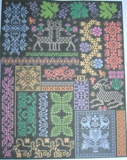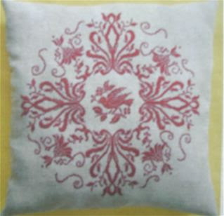 Lastly a real beauty for those who like BIG projects. Rhapsody in Red Ribbon Sampler by Sampler Cove of Thailand. 341 stitches square. Charted for two lovely hand dyed silks by Gloriana, both in the red family, though any two colors will work.