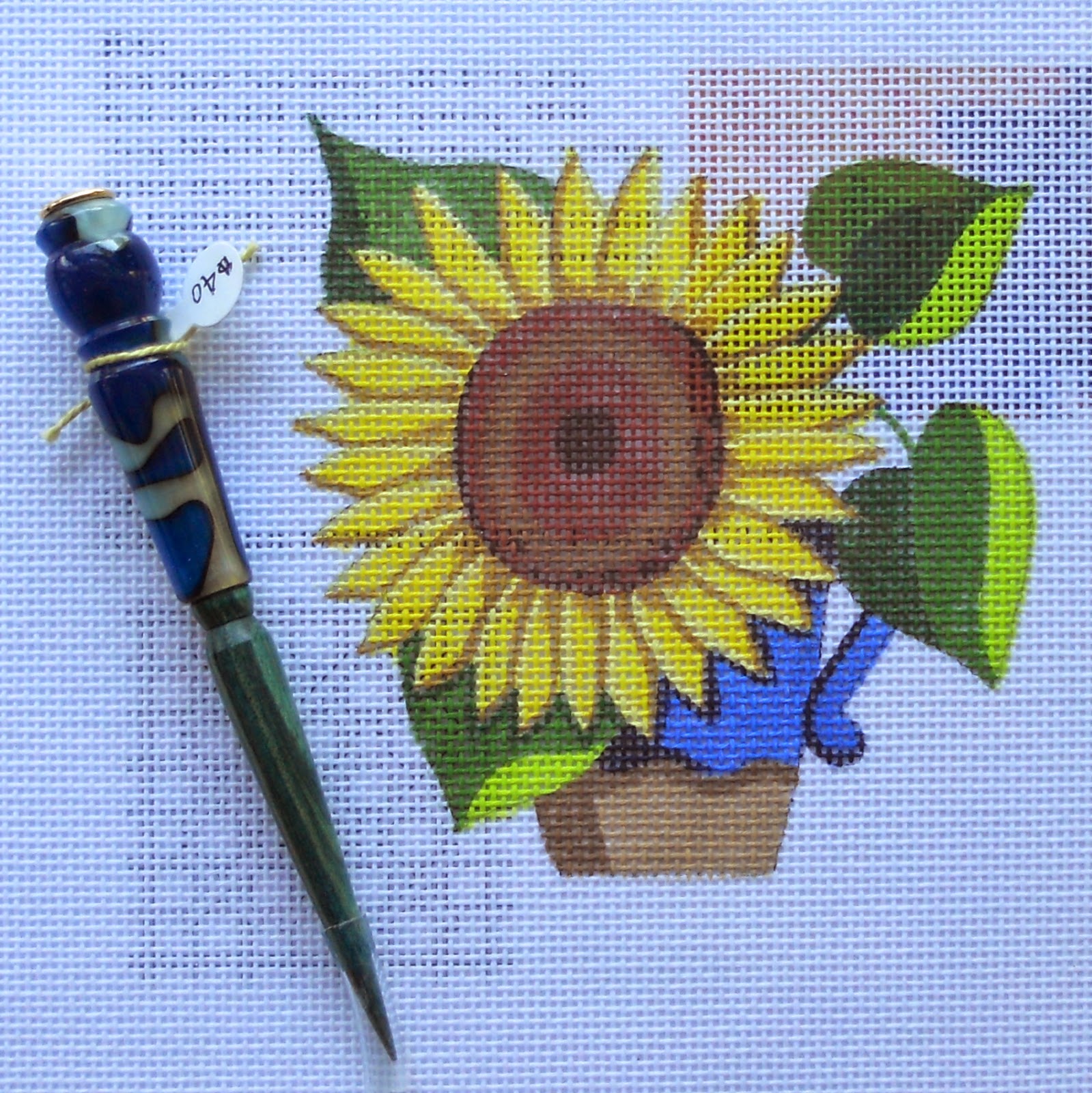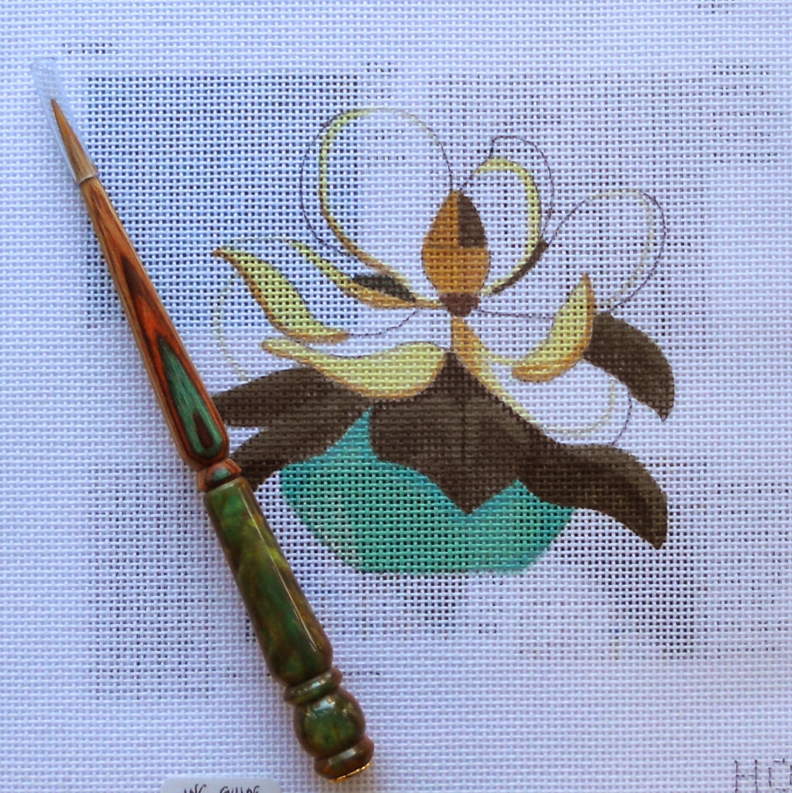 I’m not one to have just one laying tool, depends on my mood, if it feels right in my hand then and there, and most important does it do the job with that given thread. Yes I have the BLT and glass ones for sale too, but this is just about the new ones in from Rainbow Gallery. Quite ironic that each would photograph so nicely on 4 raymond crawford canvases! The halloween one was laying out well because its time to sell halloween. The others are brand new, got them along with the his hotdog needle minder. More about the canvases another time. ( but they are 49.00 each and include a marvelous guide (seen beneath the canvas) by Alison Hodgkiss).