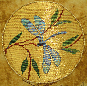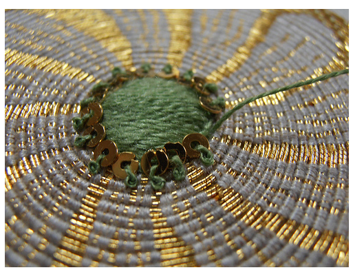“Detail from a a silk and metal thread sampler I executed and taught in the 1970’s – designed by Elsa T. Cose. Many techniques were used including applique of gold kid over padding and use of check purl “beads” in the flower center.”
