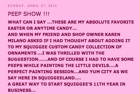 I’ve always been fond of Peeps since I was a little girl. Every easter my sisters and I were treated to Easter baskets with our annual chocolate canoe holding 3 peeps from our neighborhood candy shop http://www.auntcharlottescandy.com. My sister Donna and I always let our peeps ripen a month or so until they were good and stale.