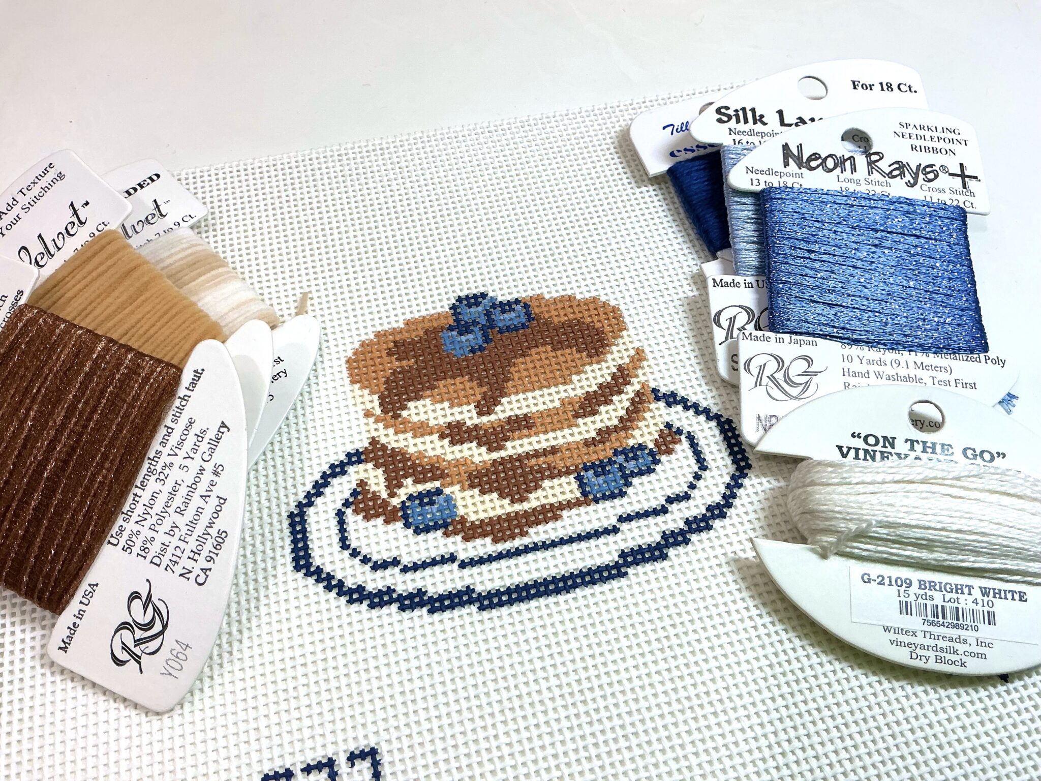 Threads include all those as shown, 2 velvets for the pancakes, frosty rays for syrup, Essentials, Silk lame and Neon Ray+ for blueberries. And vineyard for the plate.