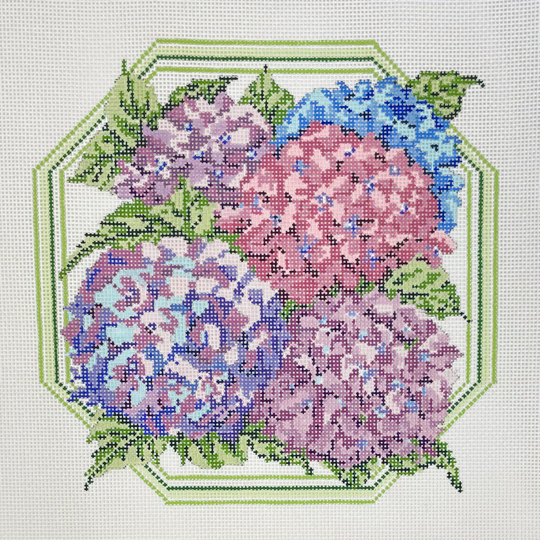 Design area is stitch painted on 13 count canvas, 10″ x 10″.