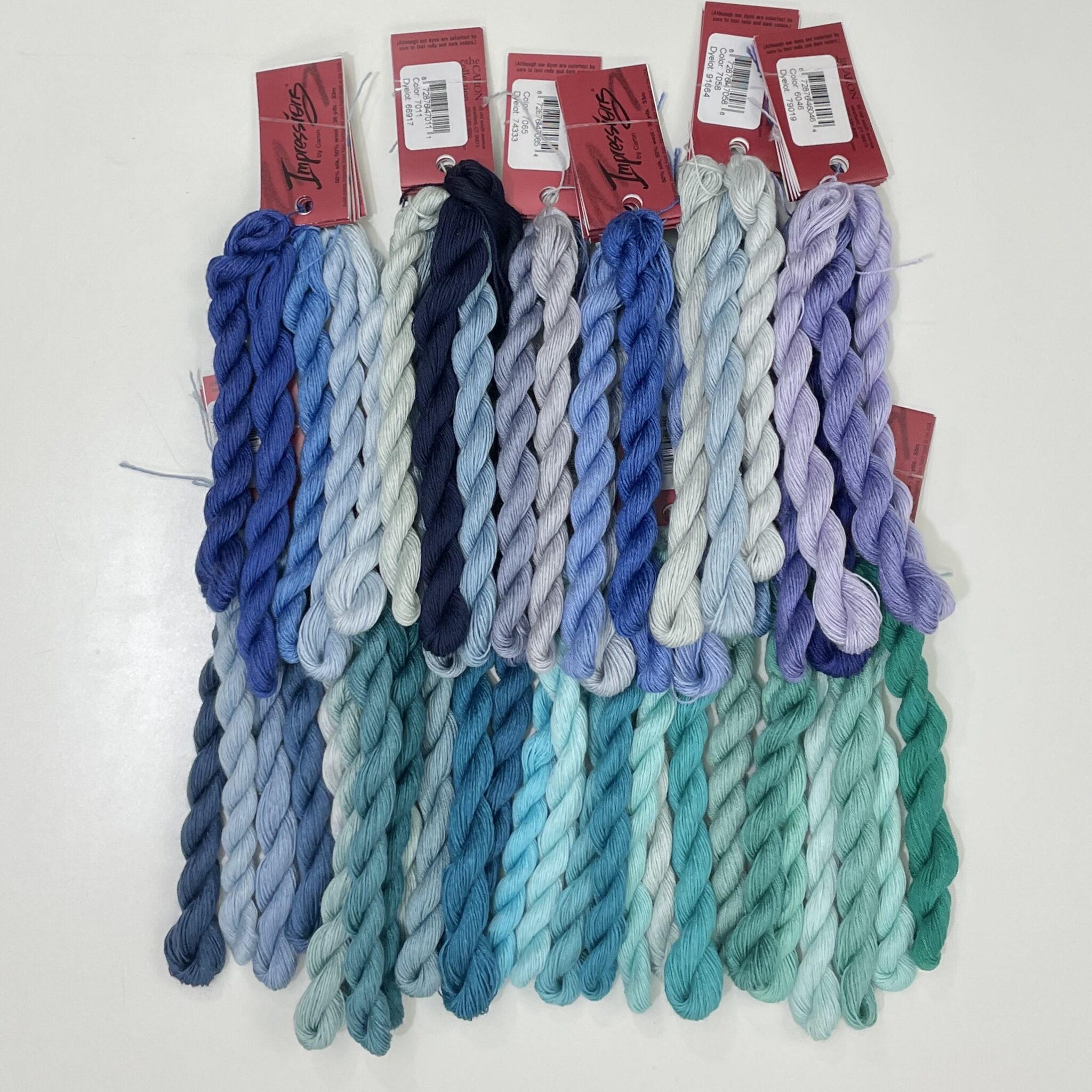 Includes one 36 yard skein of 54 colors representing 13 different color families. Represents all shades of blues, blue violets and blue greens. Threads will be bundled in families.