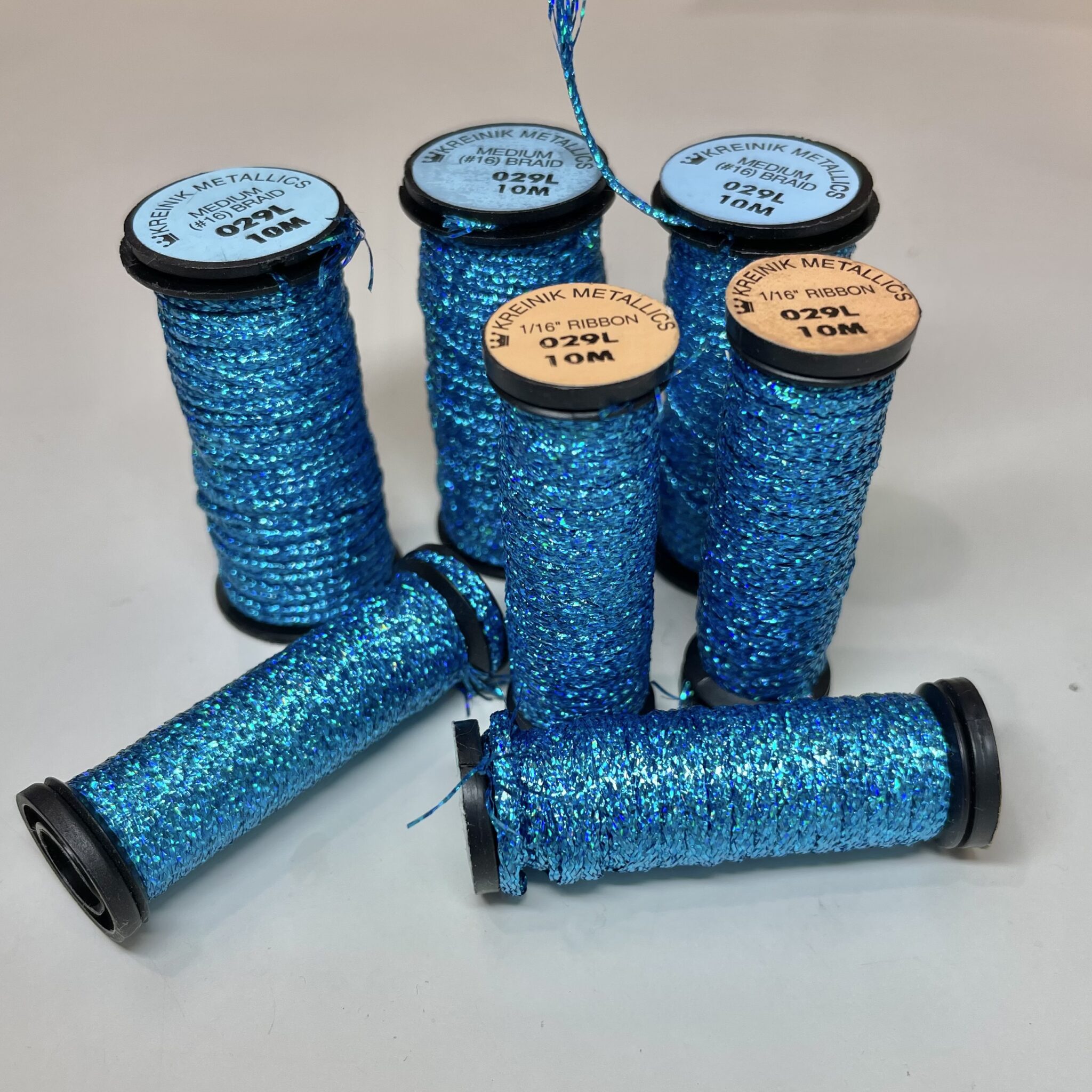 Includes 3 10 meter spools size 16 Braids, 3 10 meter spools 1/16th ribbon and 1 5 meter spool of Kreinik 029L Turquoise Holographic. Super shiny and metallic looking.