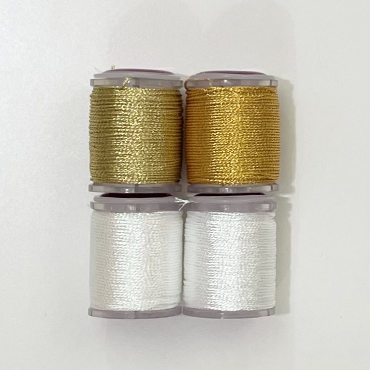 Curious about the new metallic thread Radiance? A perfect opportunity to try it out in 2 popular shades of Golds and 2 different Whites. Use as a single strand right off the spool. Similar to a size 8 in the Kreinik brand.