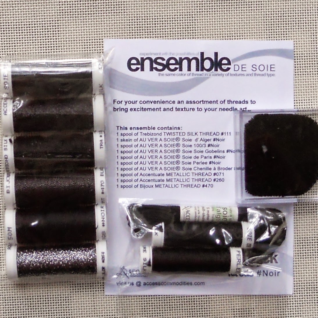 Sometimes your stitching something black, but what kind of black is it?  Should it have a sheen and yet that just doesn’t cut it.  Hmmm maybe if I add a little shimmer that will be better.  Or stitching white flowers and yet all the white flowers can’t be the same as the next or the bouquet will look like a mass instead of individual flowers.  So maybe you need to manipulate each of the whites.  Thats where these kits assembled by Access Commodities come in handy.  Here are few with more colors available.
