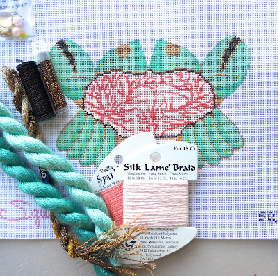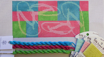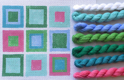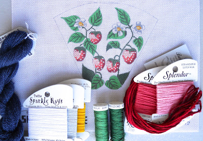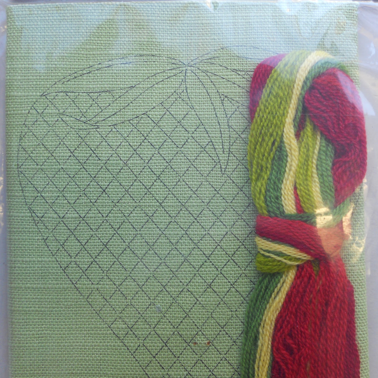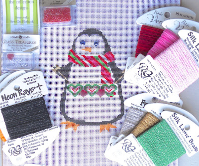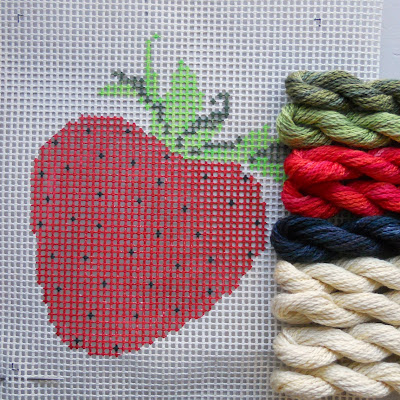 I’ve paired up some threads to go along with a few small project canvases; including large count pieces too. Barbara Bergsten’s squares are a good way to learn a few basic stitches on a 10 count canvas. It won’t take long before you can apply your newly learned skills onto something bigger. Coordinating flip flops are on 13 count. See below for a Strawberry kit, a nice piece for a child with an urge to stitch. Ive paired it up with Watercolour’s for a soft hand and nice colors but if your on a budget its offered in the online store for $27.00 including acrylic yarns. The Strawberry crewel kit is right out of 70’s, cheerful and homey with a price tag of $14.00. Lastly a cute penguin ornament complete with embellishments like the new flat back sew on sequins and glass hearts by Millhill.