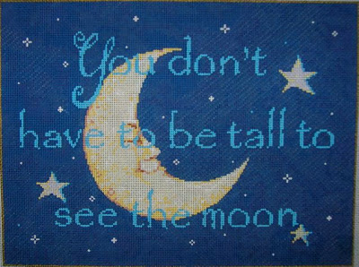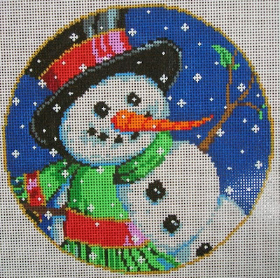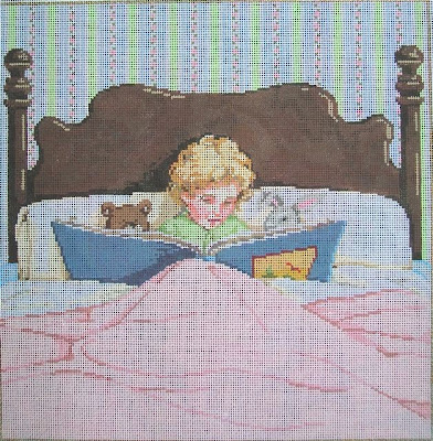A quality I like about Sandra’s pieces is the simplicity and calmness they have and yet remain strong artistically. When so many designers bend towards a shock value with humor, color and style Sandra Gilmore’s pieces are not about this. Below is a child reading a book to his/her stuffed toys; a phrase about seeing the moon and one good old fashioned Frosty the Snowman. Is it just my age that appreciates these? When a canvas is also just good art it looks great in simple stitches, or is just one kind of thread. Basketweave in Splendor? Needlepoint doesn’t always have to be about outdoing the piece you just finished. Oh, or if your like me and hardly finish anything its nice to have a simple piece to have on hand when your too tired to think or need to give your mind some time off.
