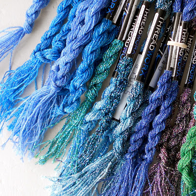 I just love Threadworx overdyed metallics because of the high shine and unusual colors. Caron Snow is a very user friendly thread as it is very soft similar to some of the older Rainbow Gallery metallics like Nordic Gold and Gold Rush. Yes there’s the white and a few other basics, but then there are the most odd colors that make me want to find something, anything to use them for. For both Threadworx and Caron Snow these are just some of the colors available and by no means their entire line. The shop does carry the entire line of Snow, and threadworx the collection continues to grow in both size 8 and 12. Personally I like size 8 braid for 18 count tent stitching. Oh costs! Snow is average for metallics but the Threadworx you do pay extra for the additional labor involved in dyeing.