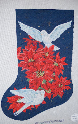 Poinsettia stocking by Barbara Russell 12 1/2″ x 18″ long on 18 count canvas. Was $165.00 now $132.00 As with all Barbara Russell Canvases this one is stitch painted making it a joy to stitch for those who prefer basketweave. I can imagine the poinsettias in red velvets with beaded centers against a sky in midnight blue silk lame braid. An elegant and timeless holiday design with modest proportions. Please let me know if you’d like to have this stocking kitted with threads.