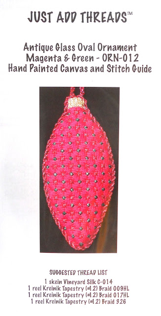 Wish I had known about these ornaments sooner. Stitch painted, easy to travel with, only use a few threads and they come with a guide. What could be better? There simplicity makes them an elegant addition to real glass ornaments or a nice counterpoint to stitched ornaments with a great deal more detail. Click on the title for more info, they price between $40 -$50 each. Not familiar with Shear Creations? these are the fine gals who brought us Stitches to Go and Stitches for Effect Books; veterans when it comes to understanding stitches.