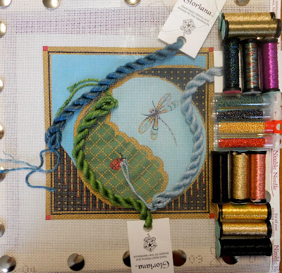 Finally today the Sundance beads arrived for the class. Easier to love beads with canvas when your working with Sundance beads. As you can see many different shades and types of gold threads. When you have metallic gold on a canvas do you think about using multiple golds? instead of just going for your favorite? Here we will use different shades of gold as well as several different types including blending filament, cord, size 4 and 12 braids, 1/16th inch ribbon, and japan thread. Personally I love how the ribbons lie whether it be from Kreinik, Fyre Werks soft sheen or Treasure Braid ribbon just to name a few. No thickness or bulk and plenty of shine.