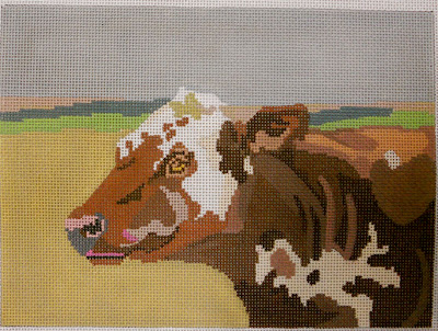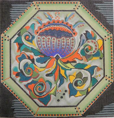 The cow detail and modernist octagons are new 2012 releases for Barbara, the squirrel is from 2011, and the Clarice……well Clarice women have been around and still keep on selling. Barbara’s new 2012 releases are based from an exhibit “Philadelphia Modernism” held this past year at Philadelphia’s Woodmere Art Museum. Works by Mary Hood and Agnes Hood Miller were featured and the two octagonal canvases are reproductions of ceramic trays made in the mid-century. The cow is a detail from a larger painting by one of the many art instructors the mother and daughter studied under. Springdale is the name of the home owned by the Hood family located outside of New Hope Pa and the farm was a place where much of their art was created. Barbara has several more canvases (think Chagall, Kandinsky) that are very painterly revolving around the careers by both women. For anyone wishing they lived in Paris in the 20’s or 30’s I think just hanging around Springdale would be enough to satisfy the eccentric. Hopefully soon enough Barbara will be putting up this collection on her website. Including individual canvases that are reproduction pieces from a needlepoint stair runner designed and stitched by Mary Hood that exemplifies life at Springdale. For more information see Mary G.L. Hood and Philadlephia Modernism or visit woodmereartmuseum.org