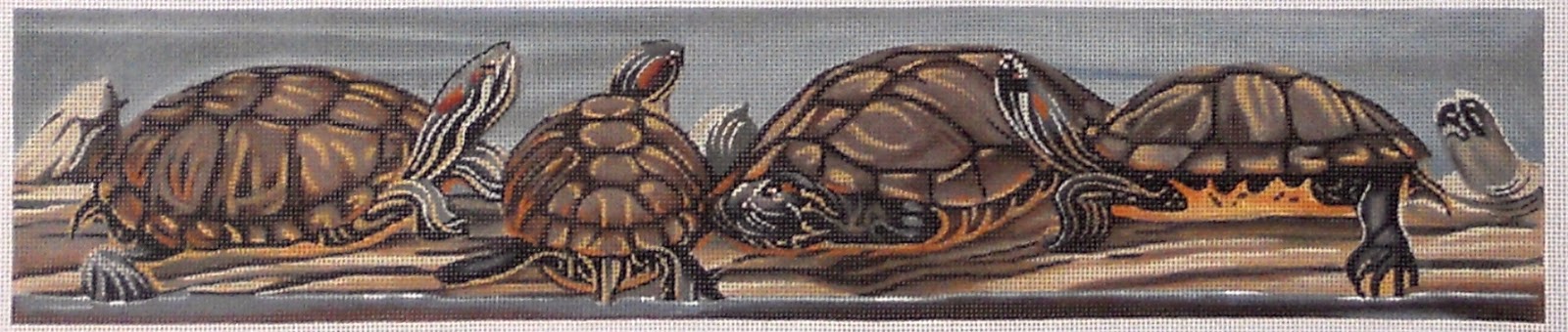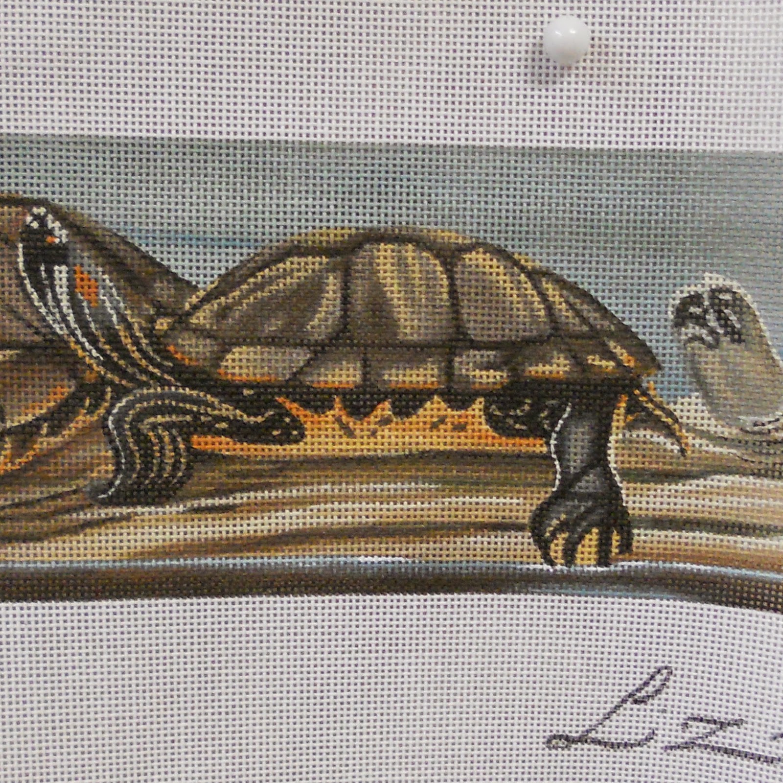 Beyond the whimsey of Birds of a Feather is a much more dignified rendition of box turtles by Liz Dillion. Thoughtful and curious. Measures 3 3/4″ h x 18″ hand painted on 18 count, $124.00