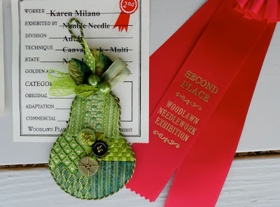 I received my items back from Woodlawn the other day and quite to my surprise I received some ribbons! Jean Krynicki from River Silks was kind enough to drop me a note mentioning she had seen my piece with ribbon receive an honorable mention and it did get me wondering… So the moral of the story is don’t be shy and think what you do may not be up to snuff to enter in 2012. Just do it and see what happens. Compared to what I see in finished needlepoint that comes into my shop and out there in cyberspace much is superior compared to my entries. I wish I had been able to go but its a heck of a day trip from Haddonfield and with the move it wasn’t possible, but there is always next year! Congratulations to all who sent something to show for the 48th Annual Needlework Exhibition.