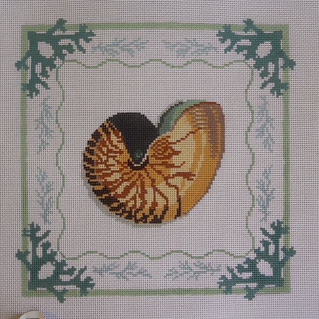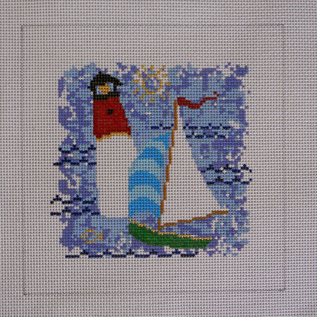 A helpful tip brought up during our weekend classes with Sharon G. is how to thread a needle when your going to work with Chenille. Here we used silk chenille by Gloriana, a new fiber from them available in a dozen plus colors. First carefully brush away the loose ply’s that make chenille…..well chenille like. You will see there are two threads that make up the core so to speak. Instead of threading your needle, you rather want to tie your needle on using the two loose strands. Makes alot of sense and I wonder if this technique is useful with other threads too? Sharon has also shown us how to tie on your needle when stitching with very fine threads like bijoux or accentuate. You know the ones that your neeedle often just wants to slip off of? I always tie on silk ribbon so the needle never slides off and you can be more efficient with the ribbon this way too. Ok, lesson time over below are 2 fresh summery canvases to help you imagine that ocean breeze.